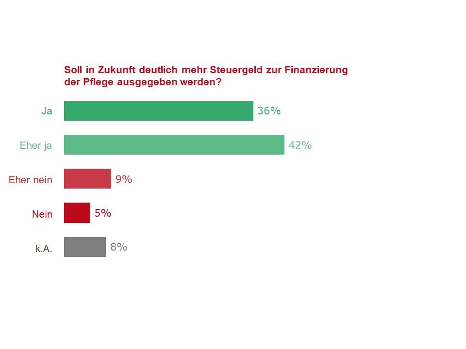 Hohe Zustimmung zu Erhöhung des Pflegebudgets aus Steuermitteln. Mehr als drei Viertel der Befragten (78%) stimmen der Aussage zu, dass in Zukunft deutlich mehr Steuergeld zur Finanzierung der Pflege aufgewendet werden sollte