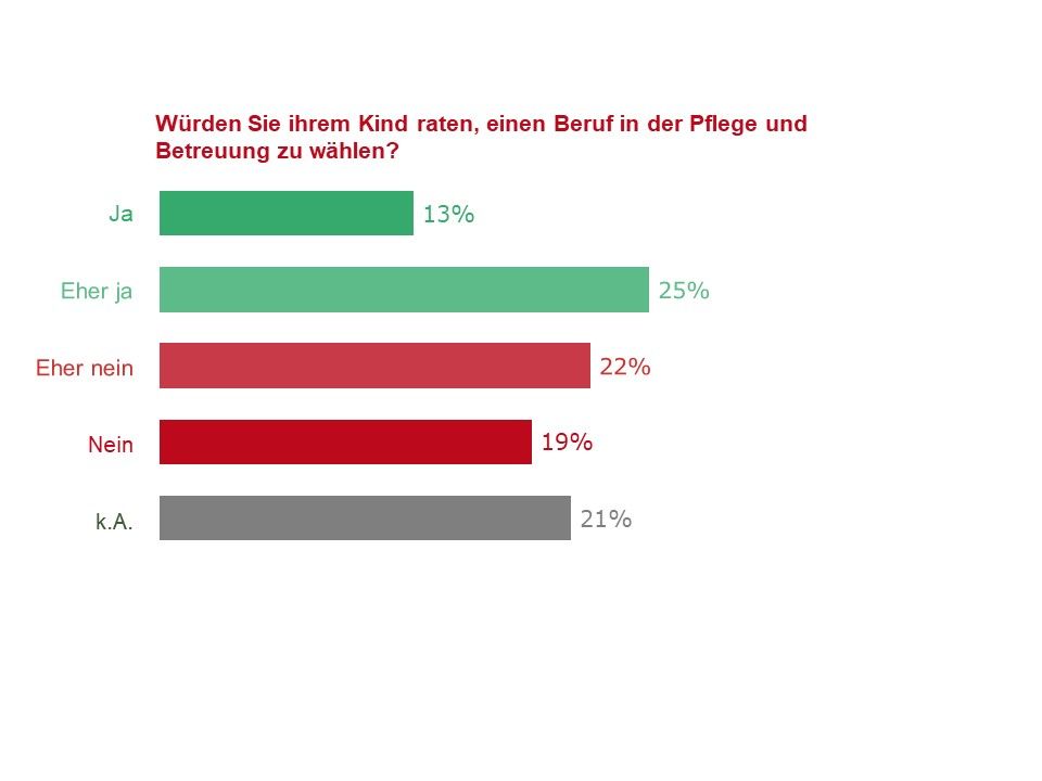Minderheit würde eigenem Kind zur Wahl eines Pflegeberufs raten. Nur eine Minderheit von 38% der Befragten würde dem eigenen Kind raten, einen Beruf im Pflegebereich zu wählen. Ein geringfügig höherer Anteil der Befragten (41%) würde dem eigenen Kind dagegen davon abraten.
