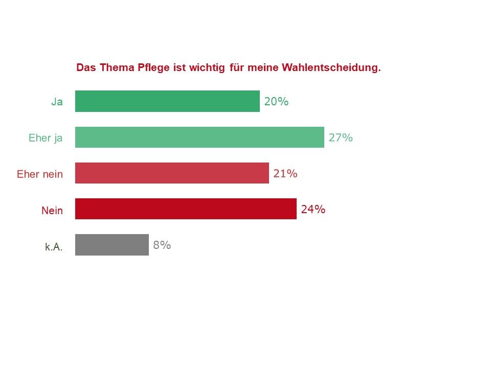 Pflege für fast jede:n Zweite:n relevant für Wahlentscheidung. Fast jede:r zweite Befragte (47%) stuft das Thema Pflege als wichtig für die eigene Wahlentscheidung ein. Die Zustimmung nimmt mit steigendem Alter zu.