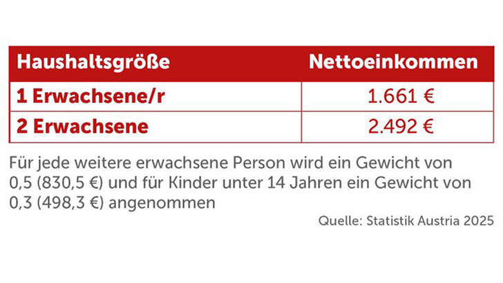 Als armutsgefährdet gilt, wer mit weniger als 60 % des mittleren Einkommens der Gesamtbevölkerung auskommen muss. Diese Einkommensgrenze wird Armutsgefährdungsschwelle genannt. Aktuell liegt sie in Österreich bei 1.661 Euro monatlich für einen 1-Personen-Haushalt. Der Wert erhöht sich pro weiterer erwachsener Person im Haushalt um 830,5 Euro.